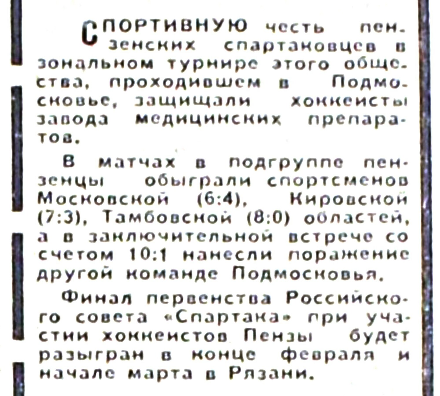 Жаль, что далеко не все официальные протоколы встреч заводчан сохранились в государственных архивах, и потому для большинства сезонов, в которых тамбовцы играли в соревнованиях сильнейших производственных коллективов РСФСР, мы имеем возможность приводить лишь приблизительный, ориентировочный состав команды, собранный с миру по нитке в самых разных источниках — от газетных статей до спортивных справочников и сайтов. И наверняка он не всегда соответствует правде. То же самое касается статистических показателей хоккеистов. Чаще всего они отсутствуют вовсе. Так, например, количество сыгранных встреч в индивидуальной статистике игроков приводится во многих случаях чисто условно, с определенной долей вероятности, в том числе и у нас. Тем не менее даже такие обрывочные сведения позволяют получить представление о хоккейных командах тех лет, о том фундаменте, который они заложили, о том фундаменте, который послужил основой и примером для будущих поколений тамбовских спортсменов и болельщиков.