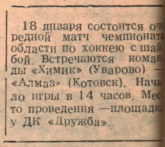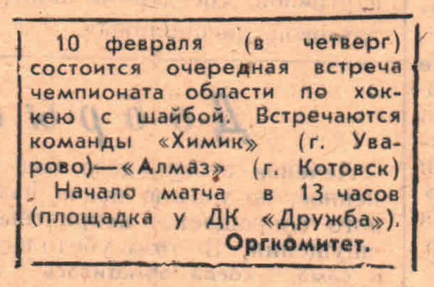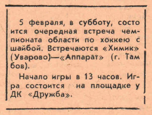 В хоккей с шайбой тогда играли на районном уровне: проводили первенства «Химмаша», организовывали товарищеские матчи с командами из Чаплыгина Липецкой области, Ряжска Рязанской области, Мичуринска.